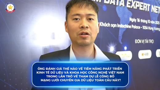 Quế Ly - Hoàng Anh10:16 | 24/10/2025Tại Lễ công bố Mạng lưới Chuyên gia Dữ liệu Việt Nam (VDEN), ông Lê Văn Đạt - Đồng sáng lập & Giám đốc điều hành XEVIFY chia sẻ đánh giá tích cực về tiềm năng phát triển kinh tế dữ liệu và khoa học công nghệ của Việt Nam. Theo ông, với sự quan tâm và định hướng rõ ràng từ Đảng và Nhà nước, cùng làn sóng ứng dụng AI và dữ liệu đang lan tỏa mạnh mẽ, Việt Nam đang đứng trước cơ hội lớn để bứt phá trong giai đoạn tới. -