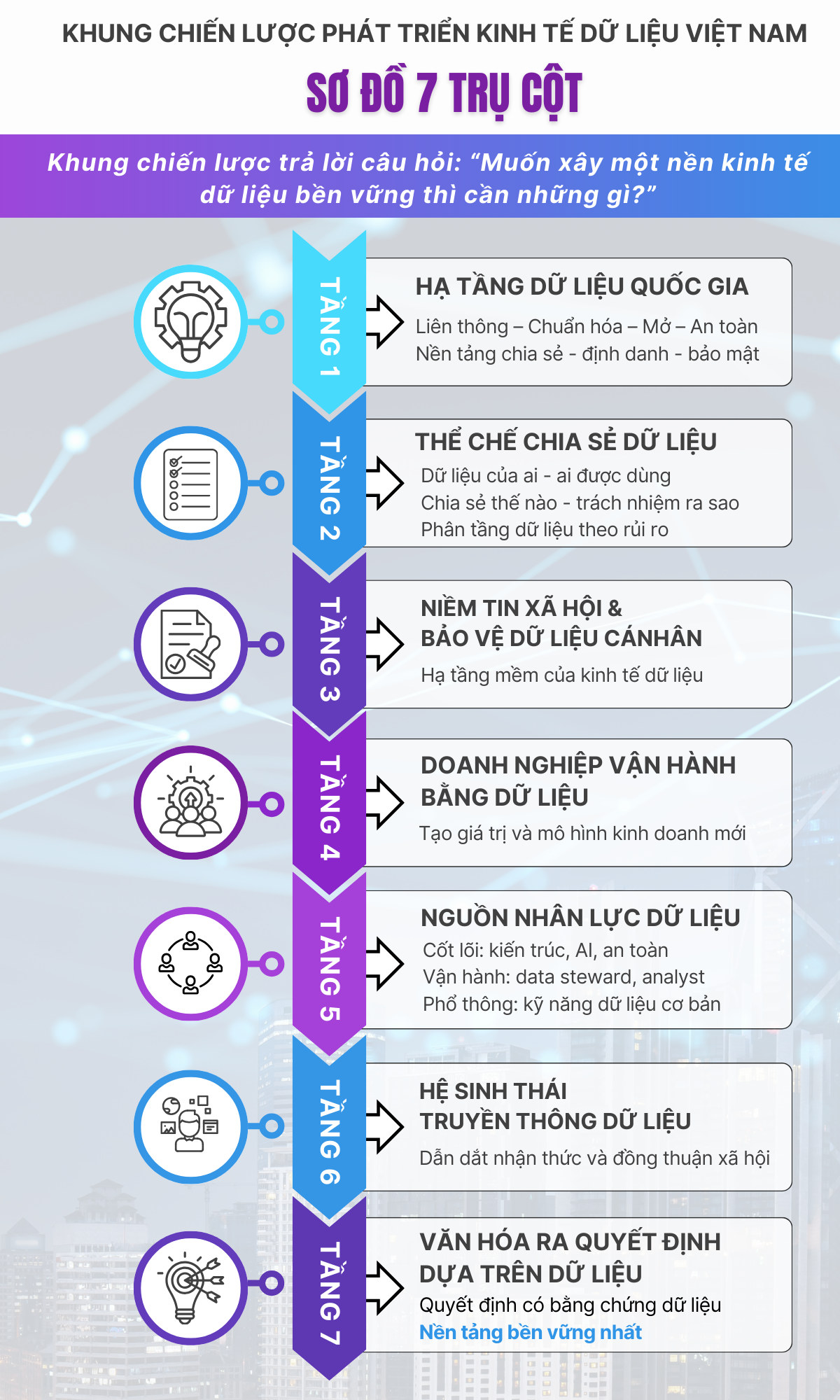 Hiệp hội17:24 | 04/03/2026Khi nói về kinh tế dữ liệu, điều quan trọng nhất không phải là chúng ta có bao nhiêu trung tâm dữ liệu, bao nhiêu nền tảng hay bao nhiêu dự án số, mà là dữ liệu có thực sự trở thành yếu tố sản xuất, tạo ra giá trị cho người dân, doanh nghiệp và năng lực cạnh tranh quốc gia hay chưa. Khung Chiến lược phát triển kinh tế dữ liệu Việt Nam được các chuyên gia trong nước và quốc tế nghiên cứu, xây dựng dựa trên 7 trụ cột, có thể hiểu theo một logic xuyên suốt, đi từ nền móng kiến tạo đến nền tảng bền vững. -