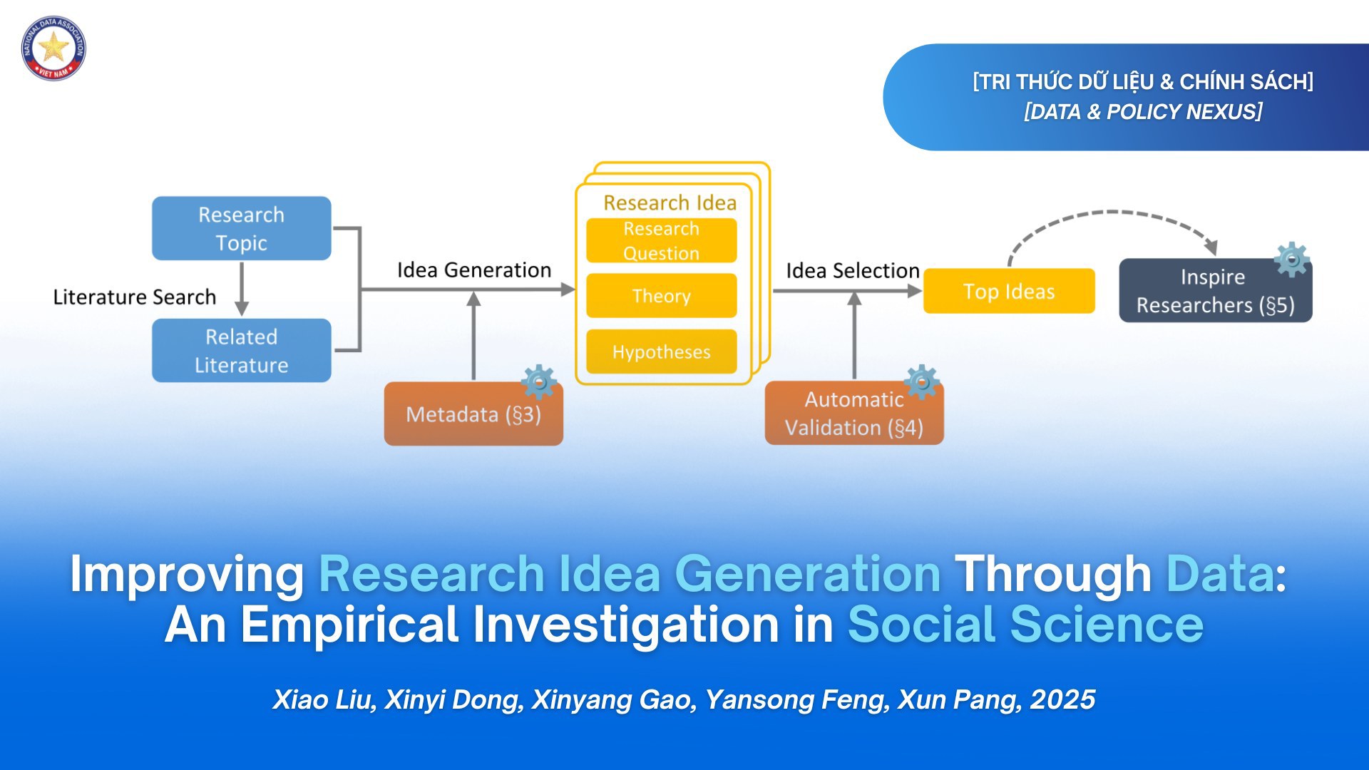 Minh An - Hoàng Anh16:55 | 06/10/2025[ TRI THỨC DỮ LIỆU & CHÍNH SÁCH ] - [ DATA & POLICY NEXUS ] Hiệp hội Dữ liệu quốc gia xin trân trọng giới thiệu góc nhìn NDA từ bài nghiên cứu quốc tế với tiêu đề “Improving Research Idea Generation Through Data: An Empirical Investigation in Social Science” (Xiao Liu, Xinyi Dong, Xinyang Gao, Yansong Feng, Xun Pang, 2025). Bài viết được đăng trên arXiv vào ngày 27 tháng 5 năm 2025. -