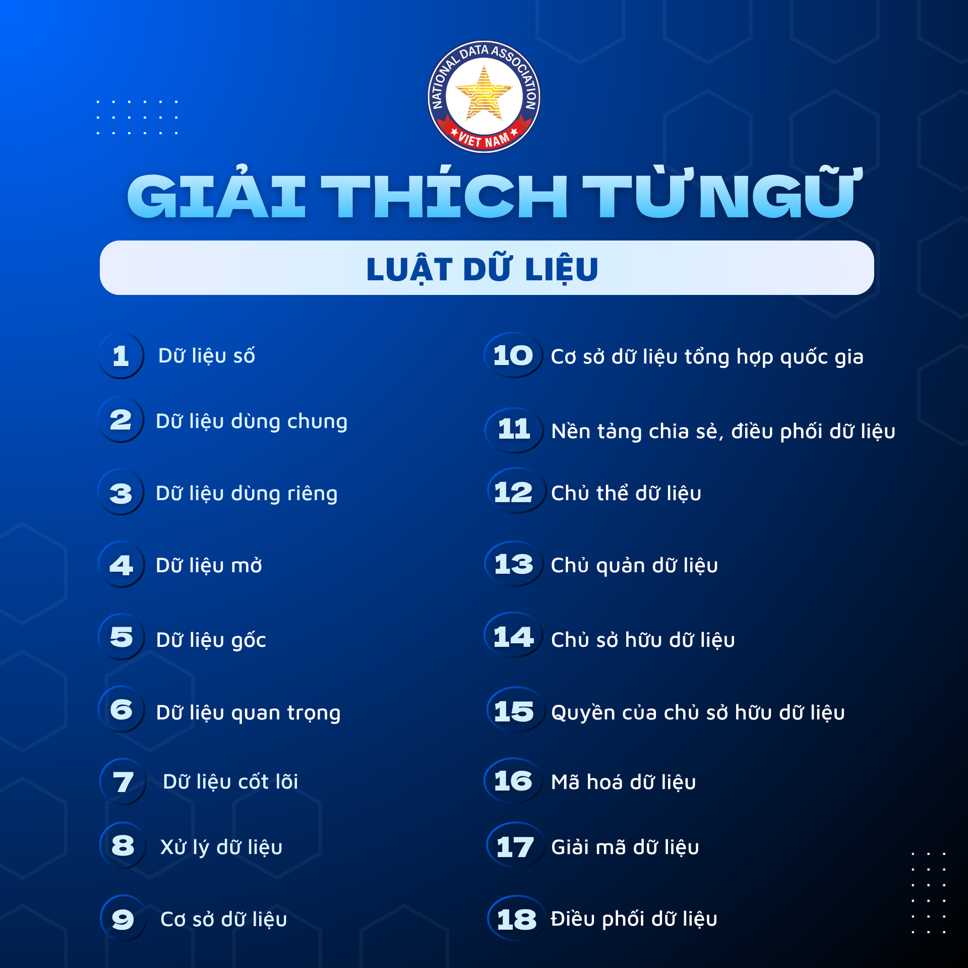 18. Điều phối dữ liệu là hoạt động tổ chức điều động và phân phối dữ liệu, quản lý, giám sát, tối ưu hóa luồng dữ liệu chia sẻ giữa các hệ thống thông tin, cơ sở dữ liệu.